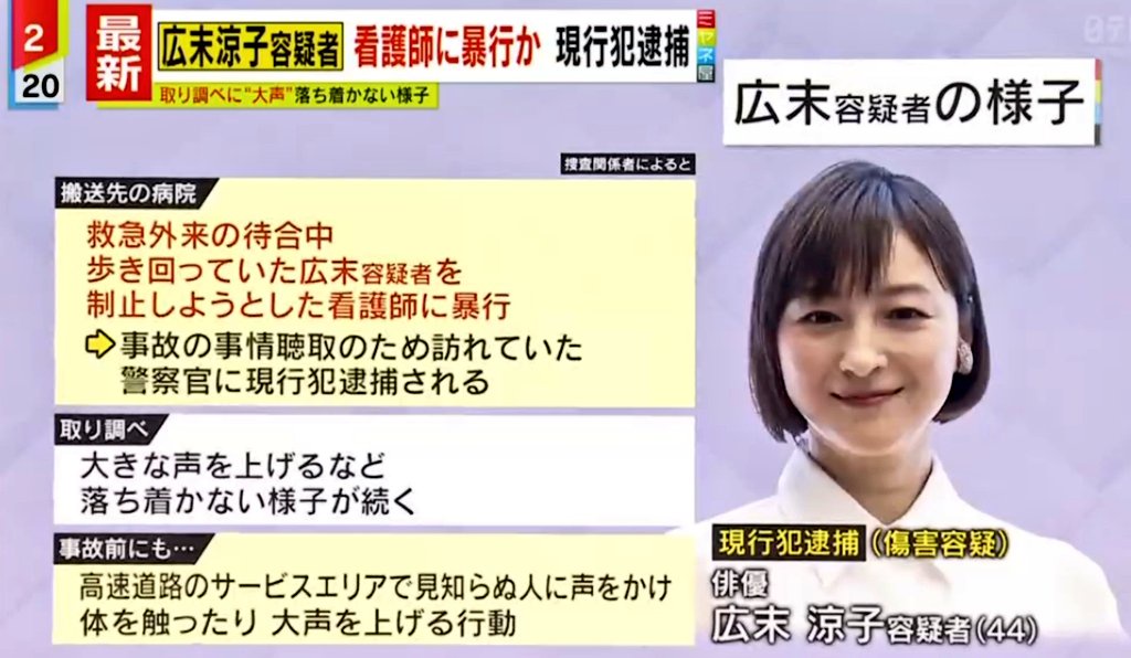 【悲報】自称俳優の広末涼子こと廣末涼子さん、逮捕 看護師を蹴り腕をひっかく