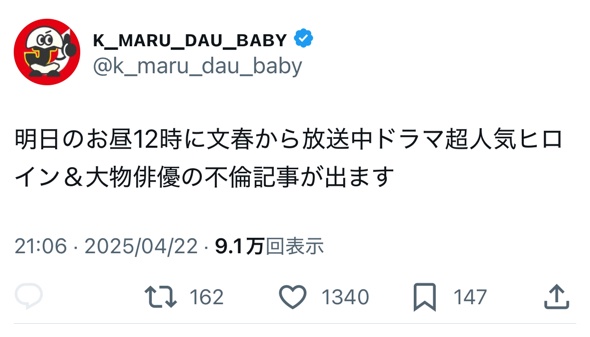 【週刊文春】放送中ドラマ超人気ヒロインと大物俳優の不倫報道