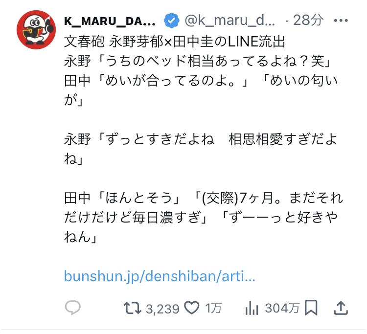 【文春砲】永野芽郁さんと田中圭さん、燃え上がる不倫LINEが流出
