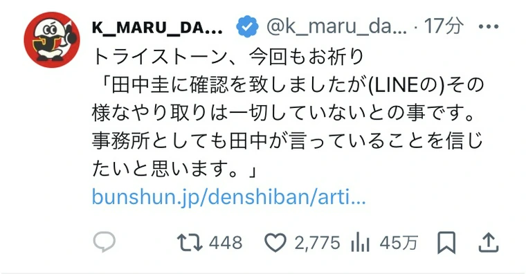 トライストーン「田中圭に確認を致しましたが(LINEの)その様なやり取りは一切していないとの事です。事務所としても田中が言っていることを信じたいと思います」