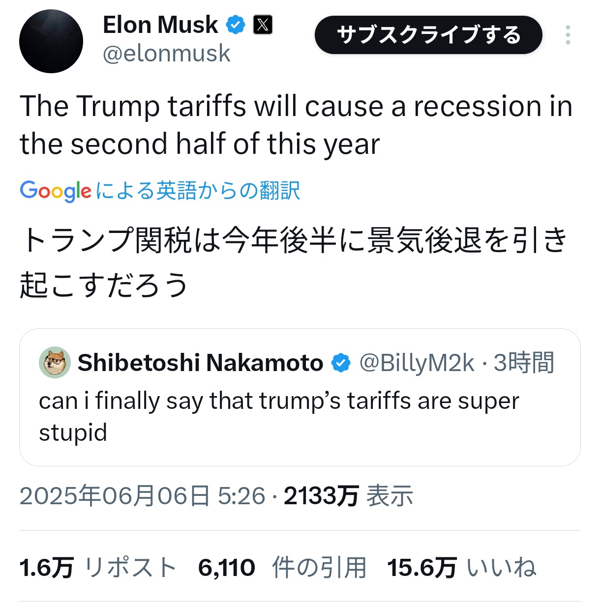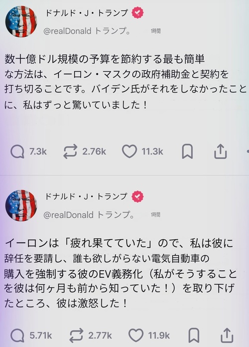 マスク氏とトランプ氏の確執でテスラ株14%急落 対立表面化以来21.5兆円失う、専門家は泥沼化を懸念 https://news.yahoo.co.jp/articles/d758407738dafcfa2d984e24c7ea7b6749943873