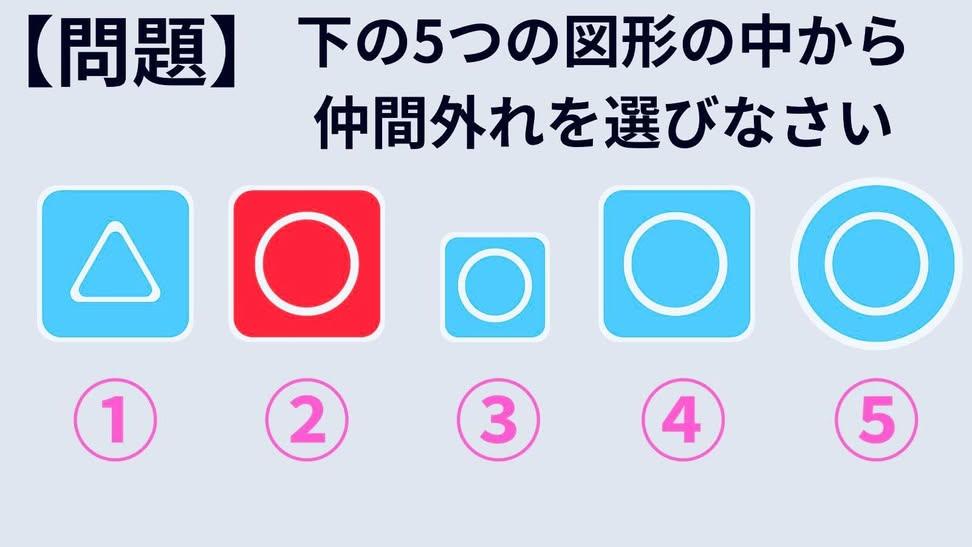 ■回答■ 正解は ④ ! 以下解説↓ それぞれの図形には「唯一の特徴」があります。 ① 中の記号が三角△ ② 色が赤🔴 ③ サイズが小さい ④ ??? ⑤ 形が丸○ ④だけは他の図形と特徴が全てかぶっている。(唯一の特徴が無い) つまり、④が仲間外れ!    だそうです🤔