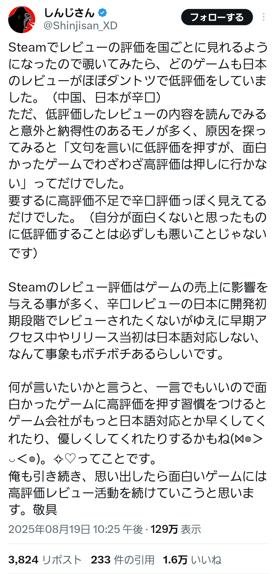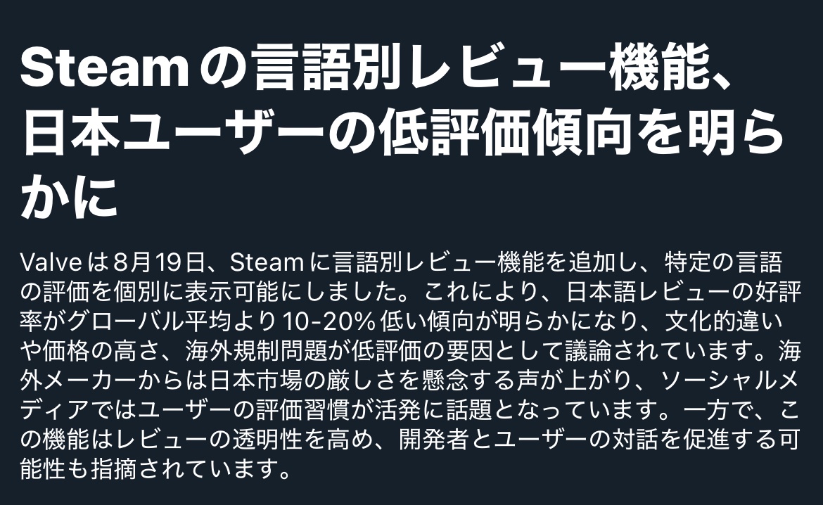 【超悲報】steam、言語別レビューを追加した結果日本人の陰湿さがより浮き彫りに