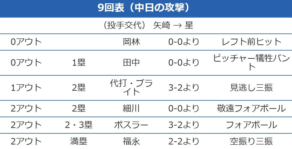 ランナー岡林で打者田中なんてスチールやらエンドランやらかなり神経使う場面が一球で終わるんやから