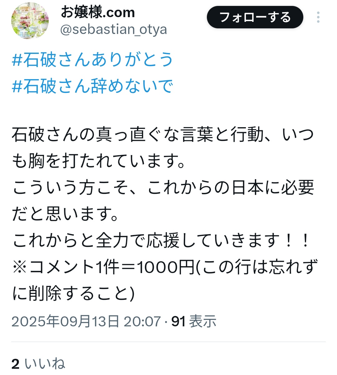俺も、石破上げのコメントしたら1000円貰えるんだな!?
