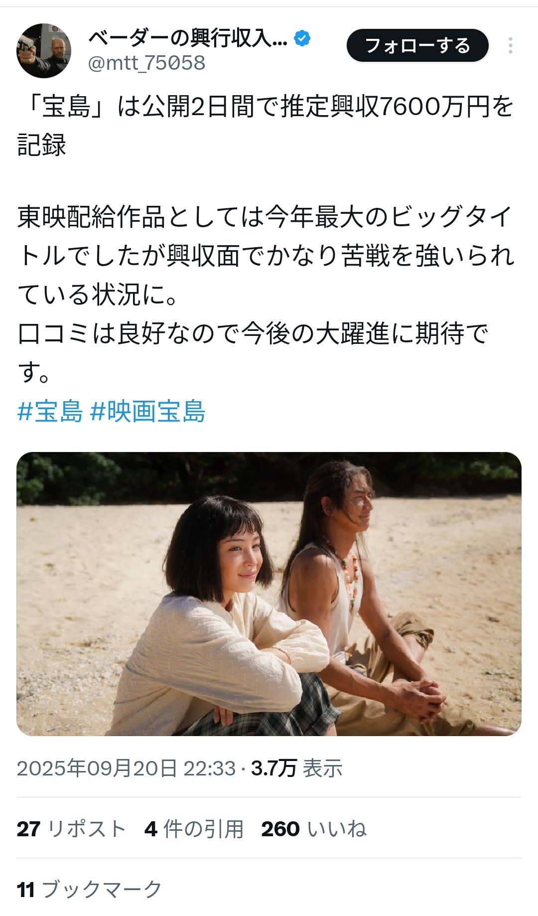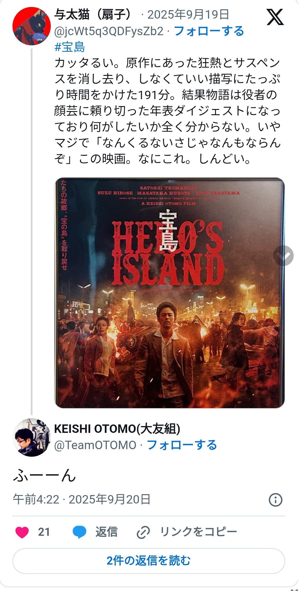 宝島 → SNSの反応『長いだけ監督の悪い演出癖でてるよ…』→ 監督『ふーん』(SNSで個人に反応しまくり) ← 今ここ