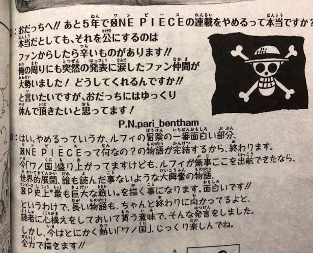 尾田「5年でワンピースの正体がなんなのかっていう主題が終わるから、まあ終わります。そのあとは巨大な戦いが始まります。」