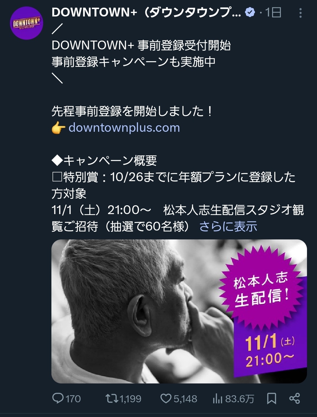 【超速報】ダウンタウン+(月額1,100円)、83万人突破wwwwwww