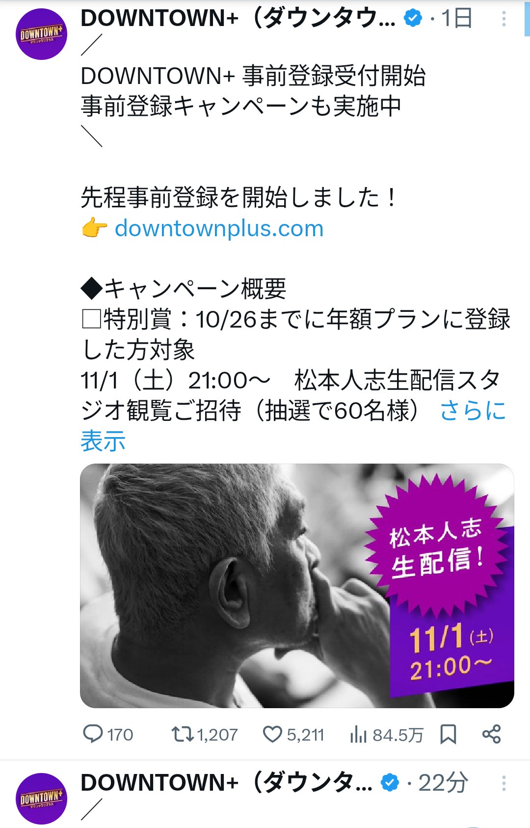 【朗報】来月開始のDOWNTOWN+、月額1100円の超良心的価格wwwwwww