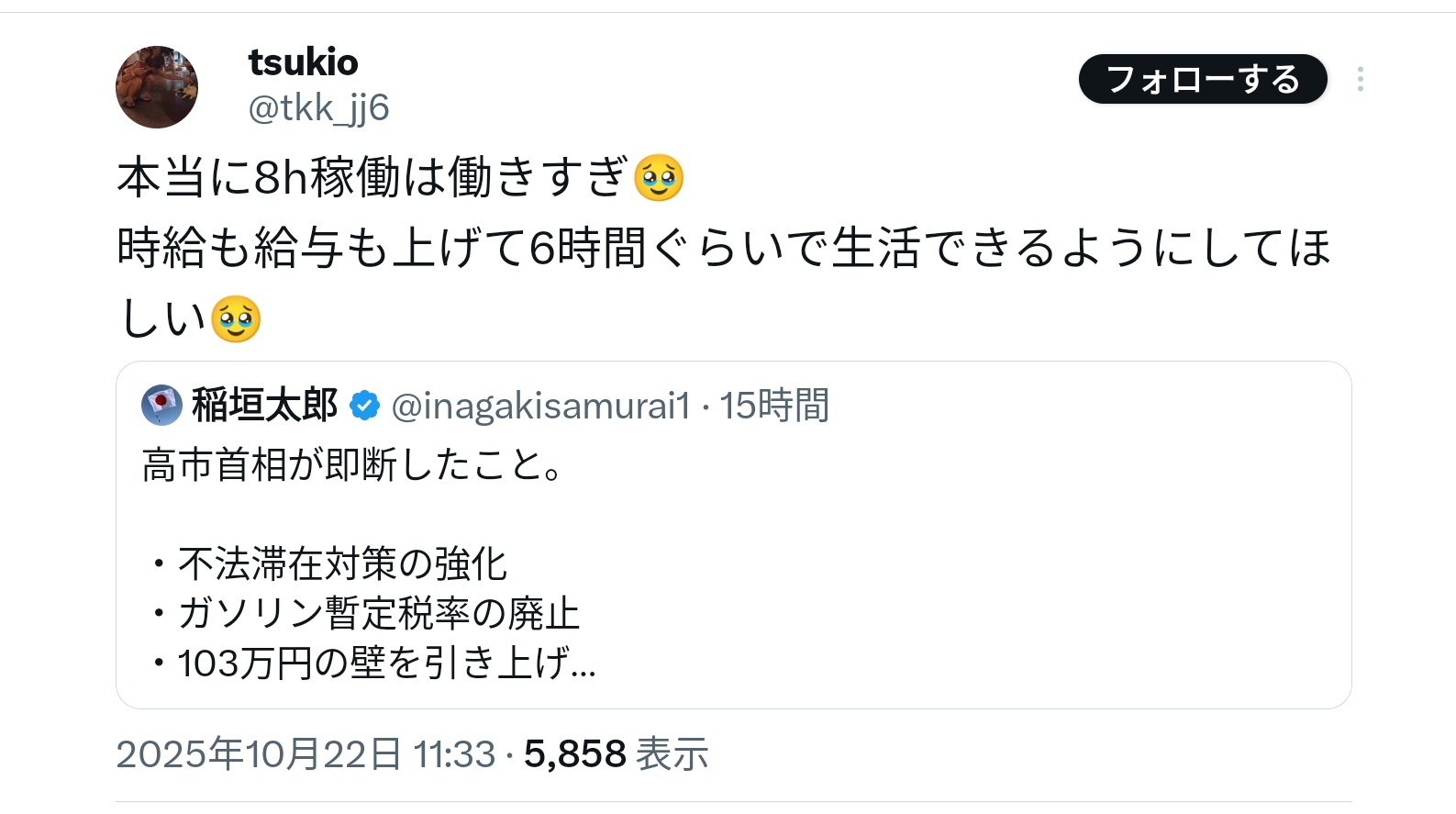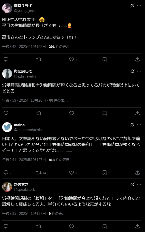 【悲報】高市早苗「労働時間規制緩和」支持者「これはサナちゃんGJ!今の労働時間は長すぎる」