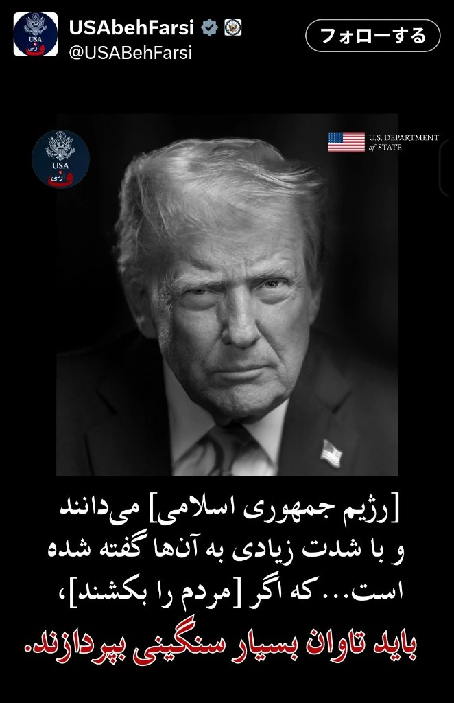 トランプ「米国は自由を求めるイラン国民を助ける準備ができている」