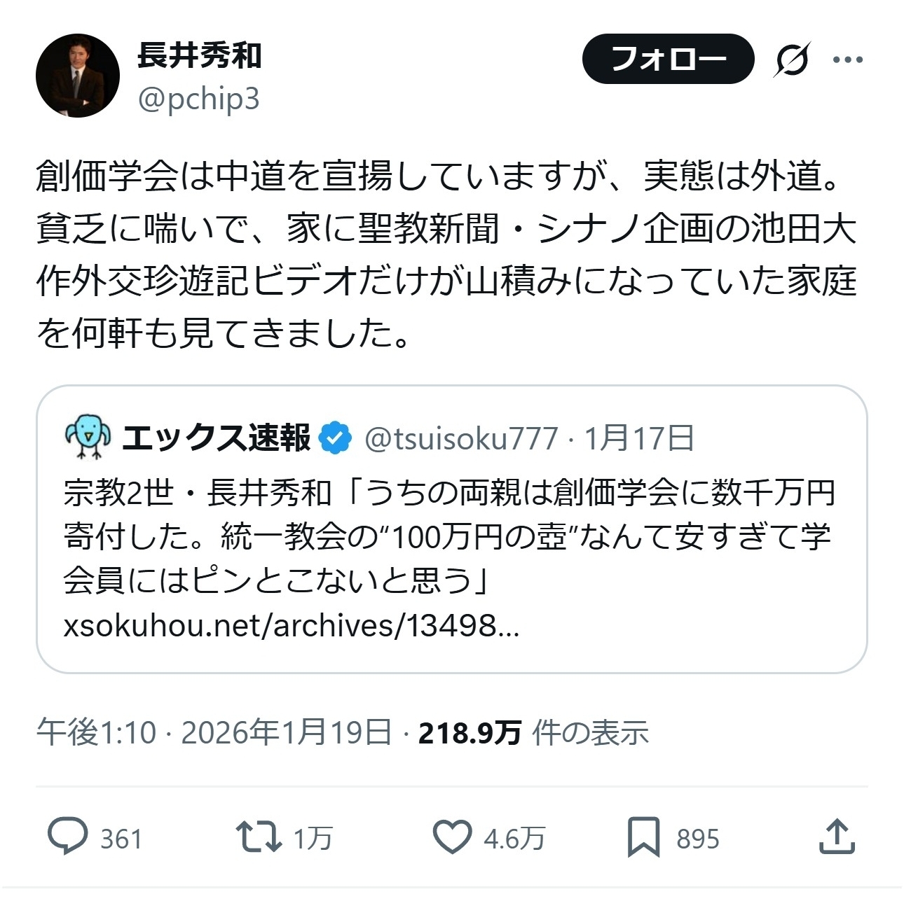 長井秀和「創価学会は中道を宣揚してるが、実態は外道。大作珍遊記ビデオが山積みの家を何軒も見てきた」